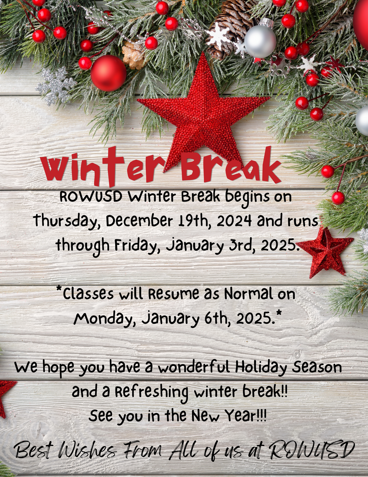 Winter Break: ROWUSD Winter Break Begins on Thursday December 19th, 2024 and runs through Friday, January 3rd, 2025.