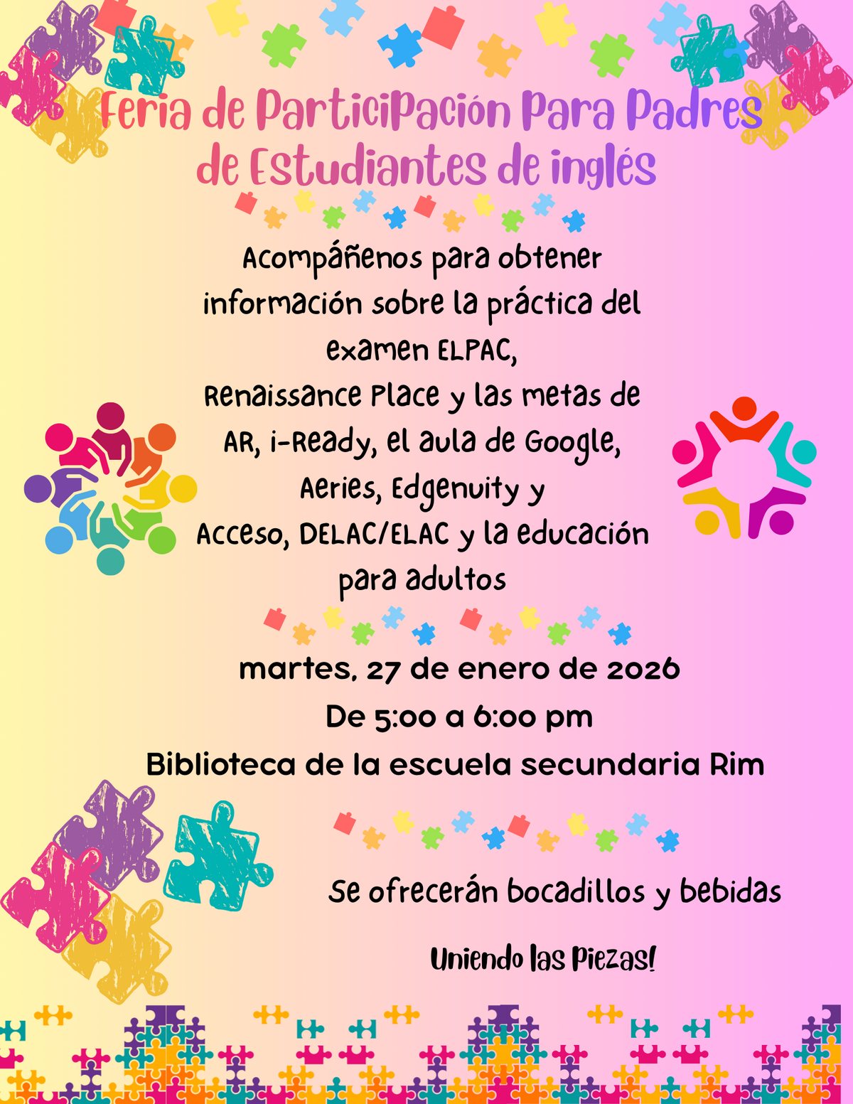 Aeries, Edgenuity & Access, DELAC/ELAC, & Adult Education. Tuesday, January 27, 2026 5:00 pm to 6:00 pm Rim High School Library. Snacks and Refreshments