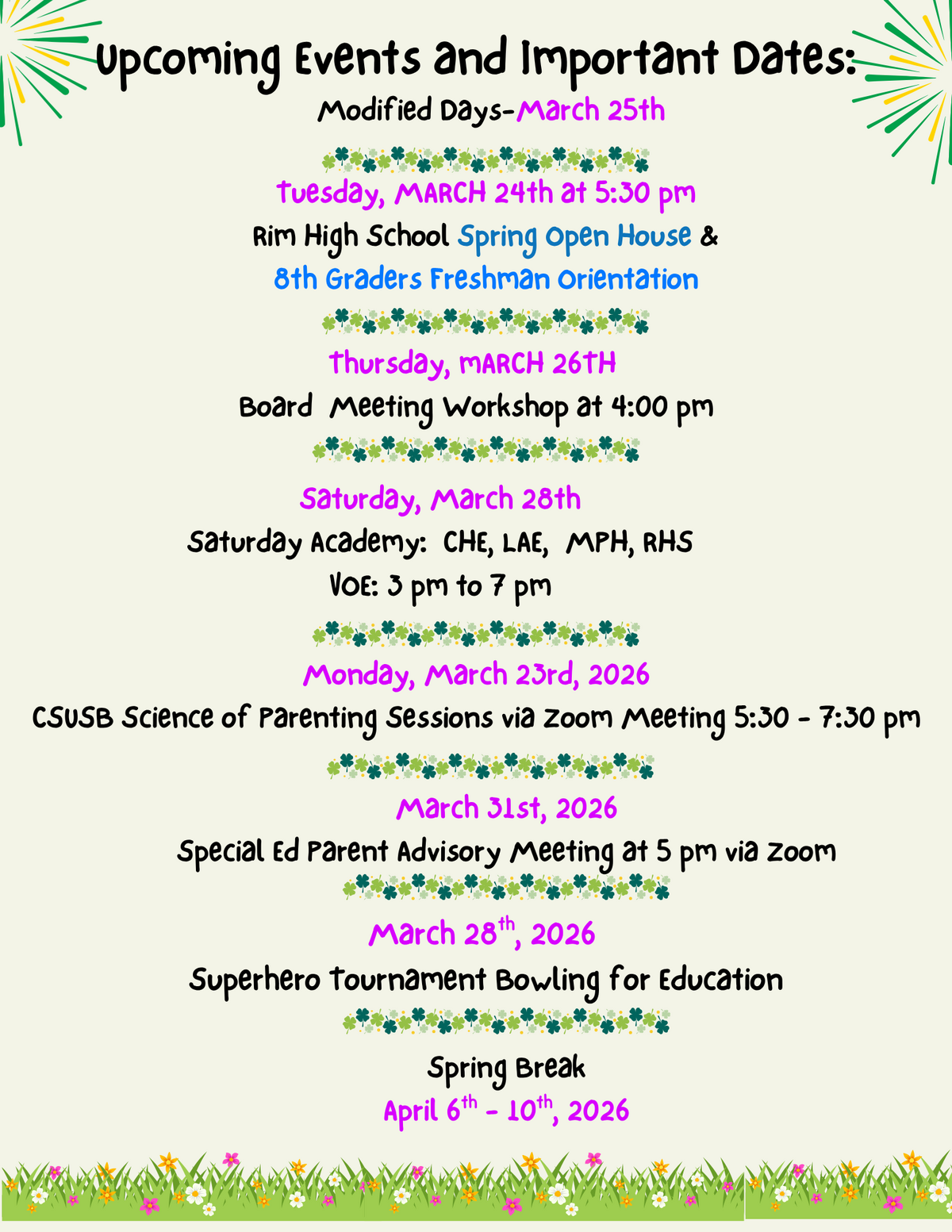 Page: Upcoming Events and Important Dates: Modified Days-March 25th, Tuesday, MARCH 24th at 5:30 pmRim High School Spring Open House & 8th Graders Freshman Orientation, Thursday, MARCH 26TH Board  Meeting Workshop at 4:00 pm, Saturday, March 28thSaturday Academy:  CHE, LAE,  MPH, RHSVOE: 3 pm to 7 pm, Monday, March 23rd, 2026CSUSB Science of Parenting Sessions via Zoom Meeting 5:30 - 7:30 pm, March 31st, 2026, Special Ed Parent Advisory Meeting at 5 pm via Zoom, March 28th, 2026 Superhero Tournament Bowling for Education, Spring Break