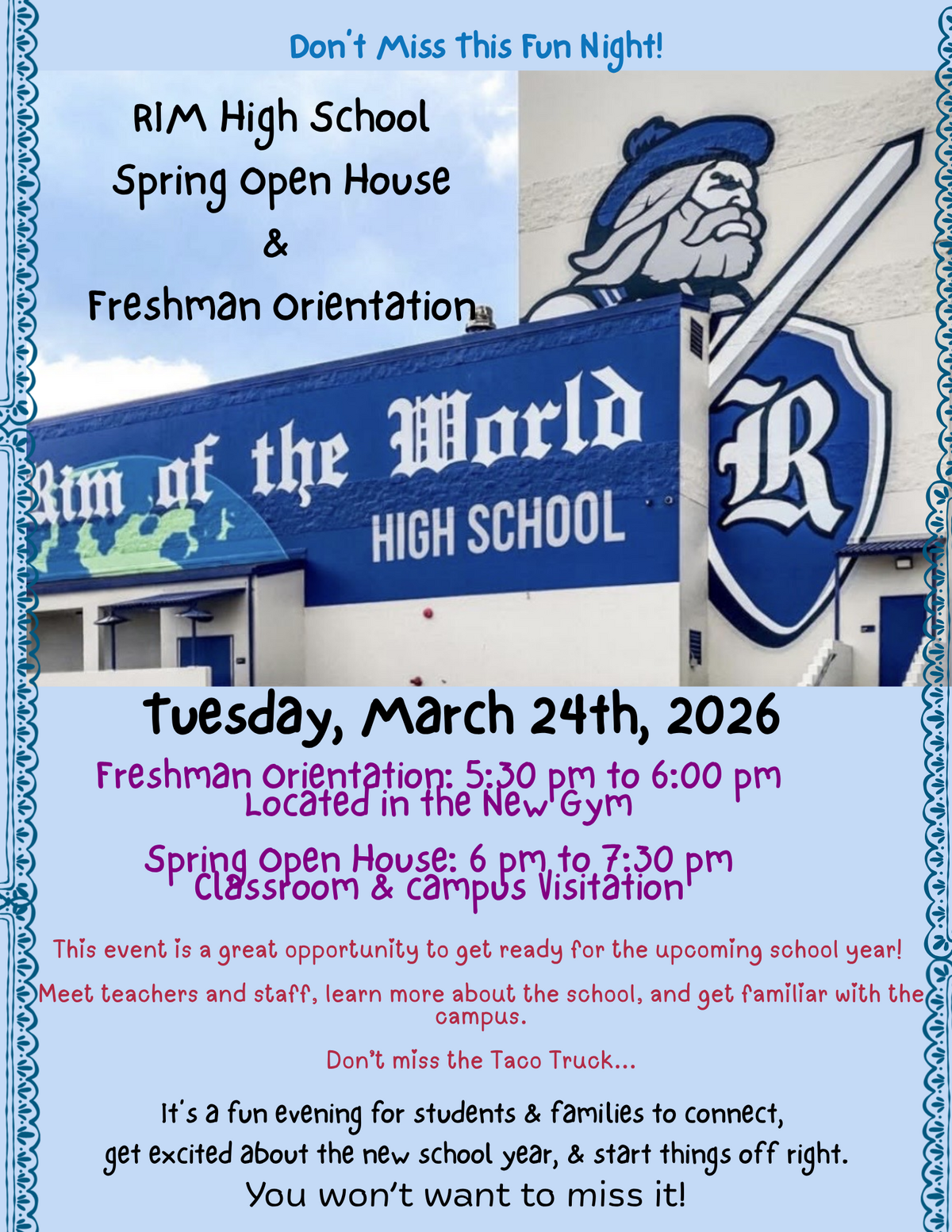 Page: RIM High School Spring Open House &  Freshman Orientation-Don’t Miss This Fun Night! Tuesday, March 24th, 2026. Freshman Orientation: 5:30 pm to 6:00 pm
