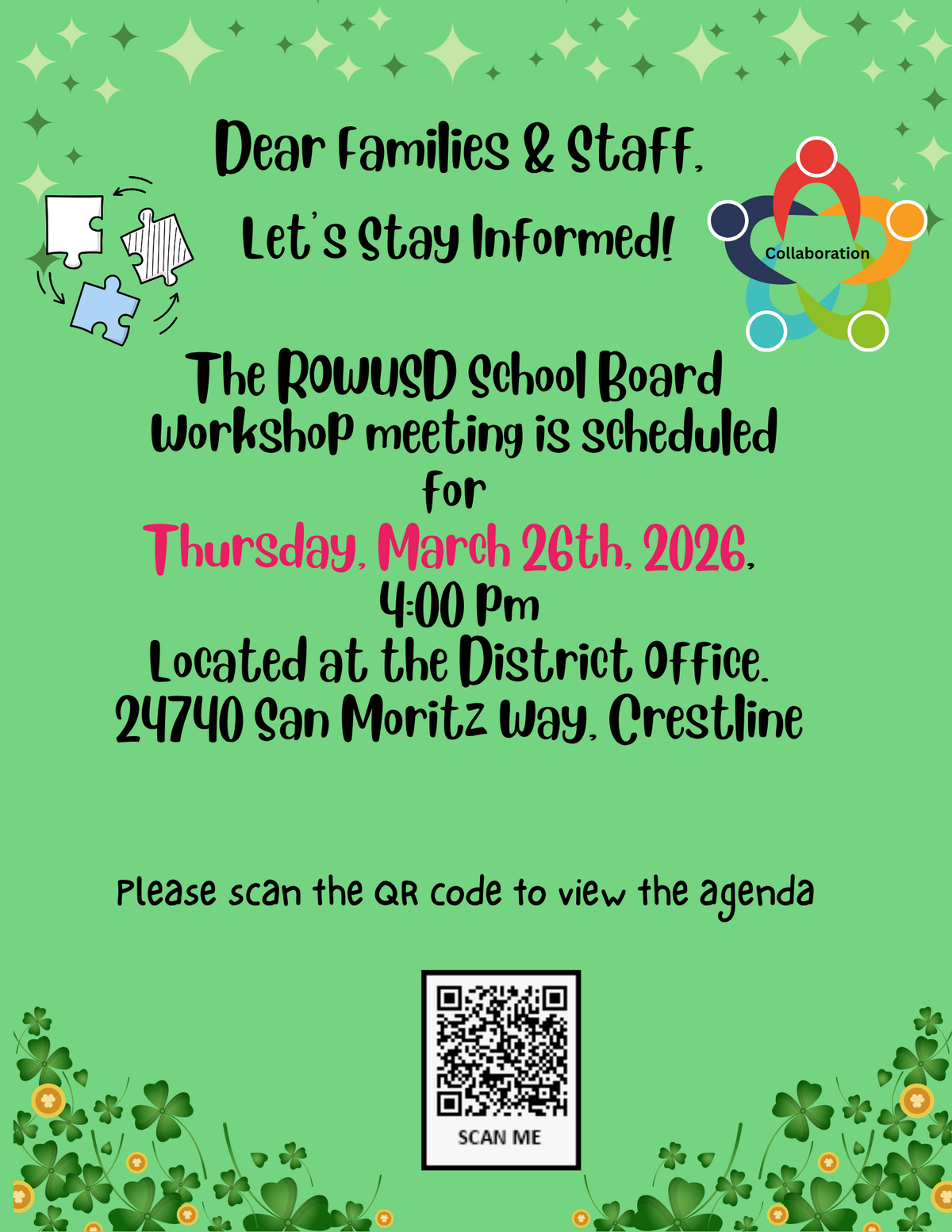 Page: Dear Families & Staff, Let’s Stay Informed! The ROWUSD School Board Workshop meeting is scheduled for Thursday, March 26th, 2026,  4:00 pm