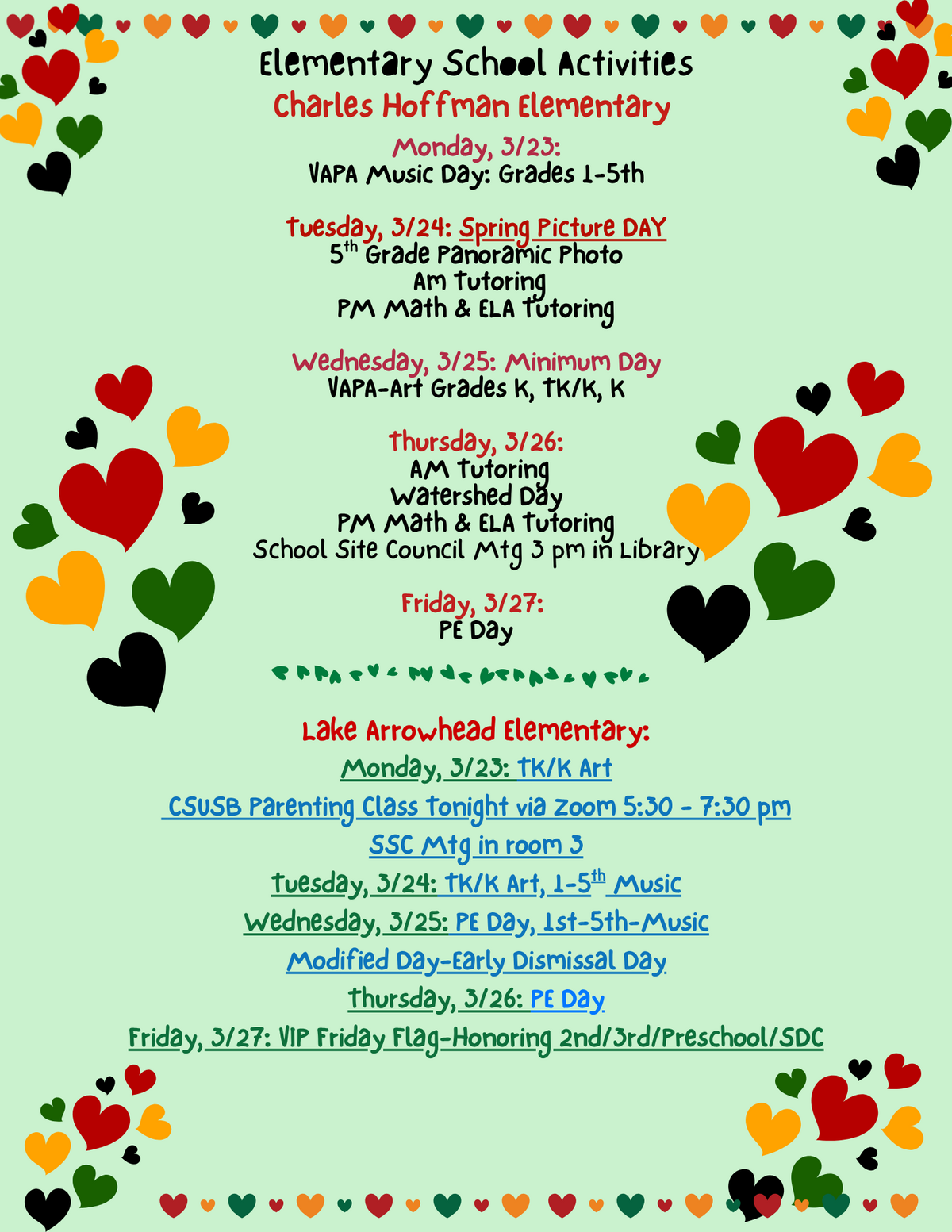 LAE: Monday, 3/23: TK/K Art CSUSB Parenting Class Tonight via Zoom 5:30 - 7:30 pm, SSC Mtg in room 3Tuesday,  3/24: TK/K Art, 1-5th Music Wednesday, 3/25: PE Day, 1st-5th Music Modified Day-Early Dismissal Day Thursday, 3/26: PE Day Friday, 3/27: VIP Friday Flag-Honoring 2nd/3rd/Preschool/SDC