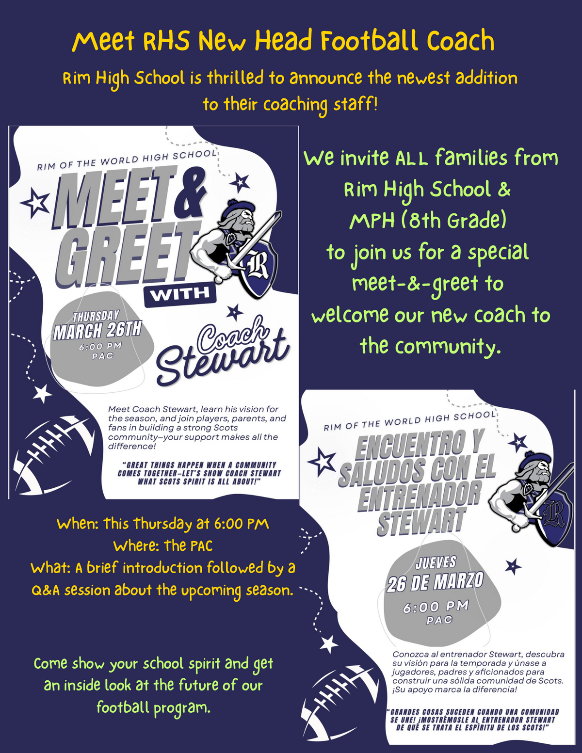 Page: Meet the RHS New Head Football Coach. Rim High School is thrilled to announce the newest addition to its coaching staff! We invite ALL families from Rim High School & MPH (8th Grade) to join us for a special meet-&-greet to welcome our new coach to the community. When: This Thursday at 6:00 PM