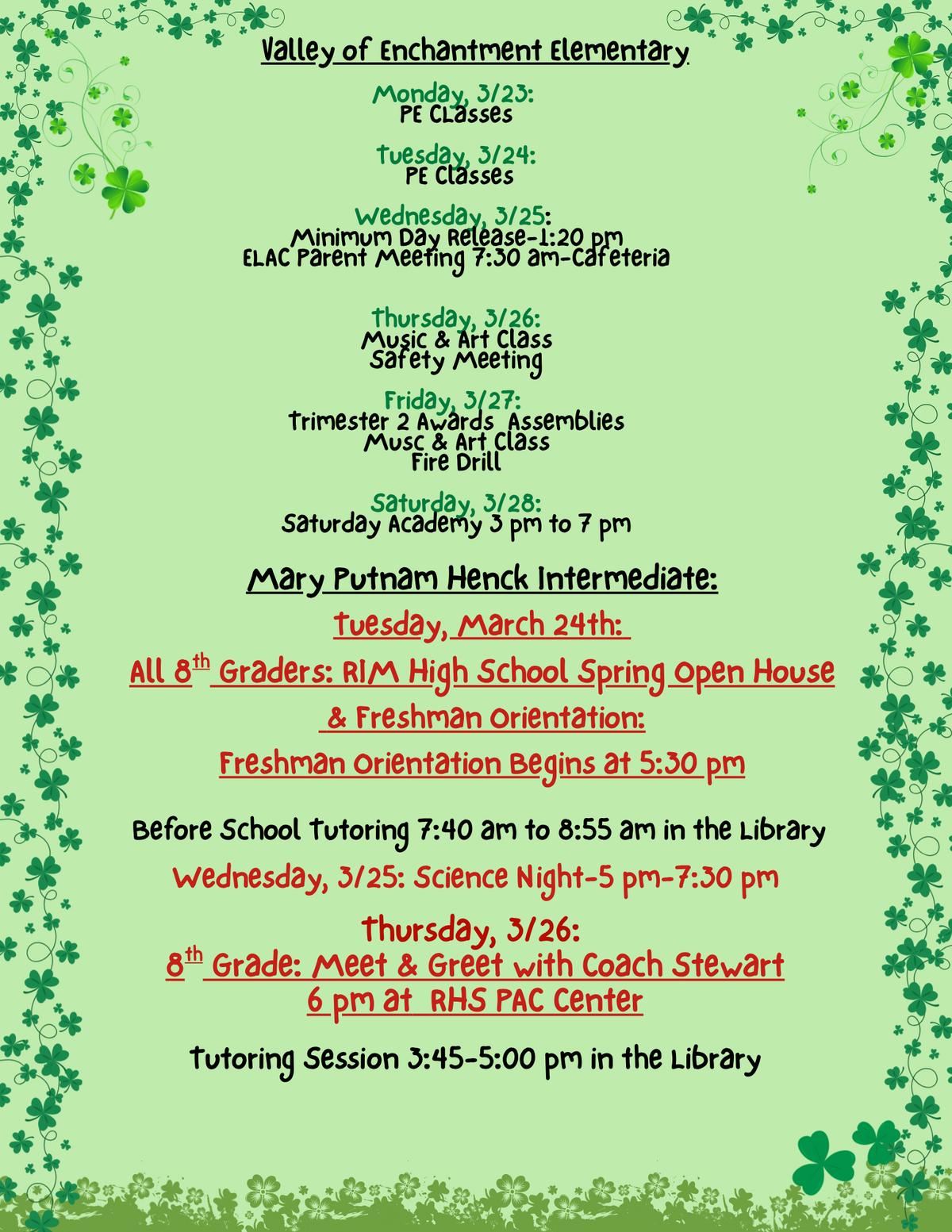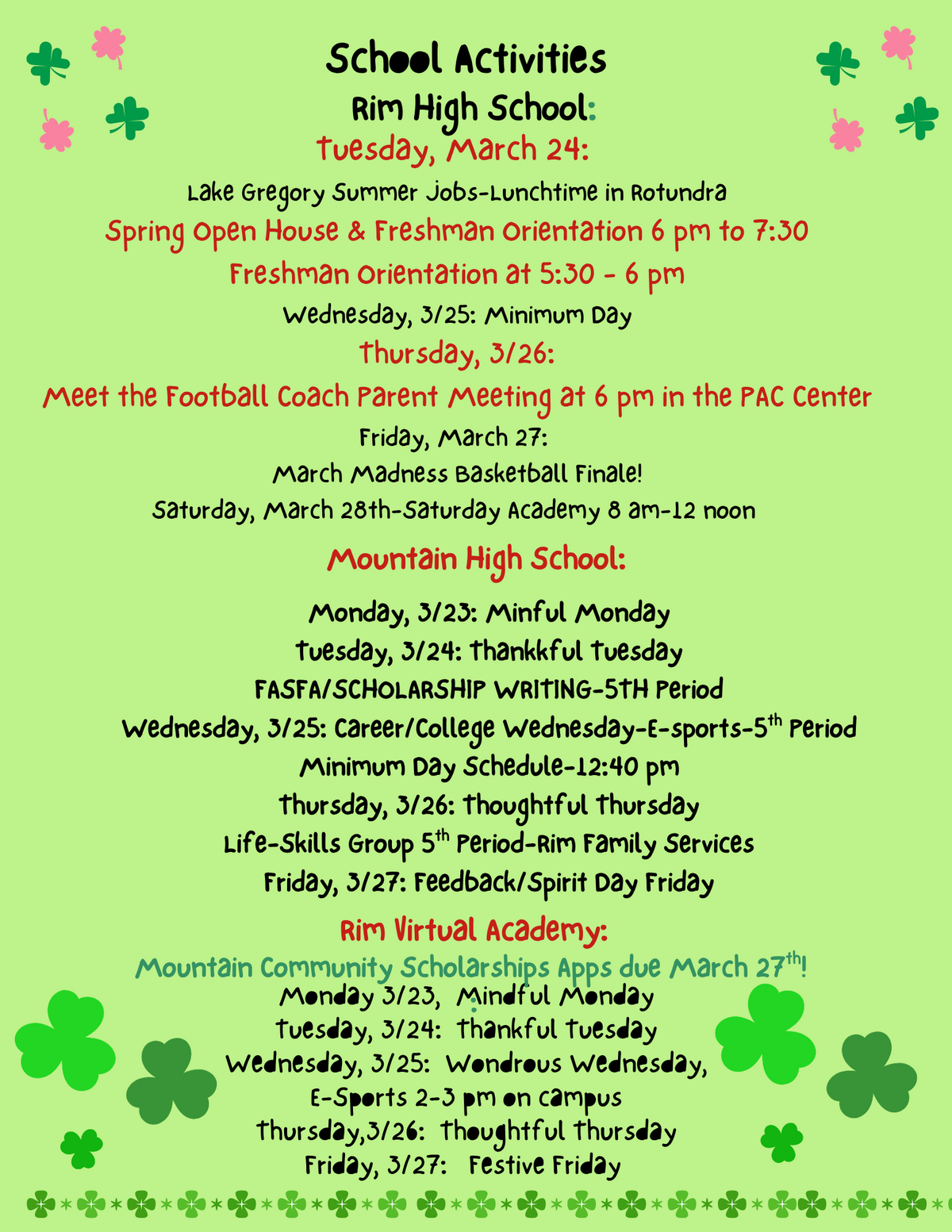 MHS: Monday, 3/23: Minful Monday, Tuesday, 3/24: Thankkful Tuesday, FASFA/SCHOLARSHIP WRITING-5TH Period, Wednesday, 3/25: Career/College Wednesday-E-sports-5th Period, Minimum Day Schedule-12:40 pm, Thursday, 3/26: Thoughtful Thursday, Life-Skills Group 5th Period-Rim Family ServicesFriday, 3/27: Feedback/Spirit Day Friday