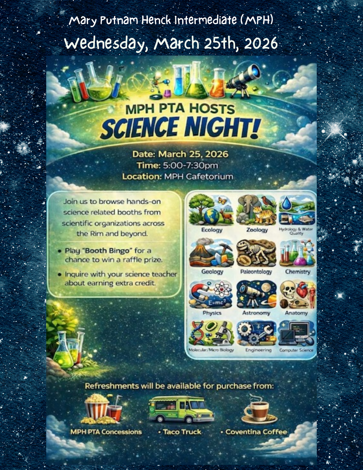 Mary Putnam Henck Intermediate (MPH) hosts Science Night on Wednesday, March 25th, 2026. March 25th, 26 from 5 pm to 7:30 pm at the MPH Cafetorium. Join us to browse hands-on science-related booths from scientific organizations across the Rim and beyond.  Play Booth Bingo for a chance to win a raffle prize, and inquire with your science teacher about earning extra credit. There will be refreshments available for purchase from MPH Concessions, Taco Truck, and Coventina Coffee.