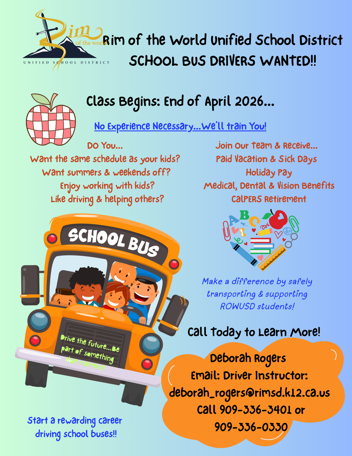Page: Rim of the World Unified School District SCHOOL BUS DRIVERS WANTED!! Class Begins: End of April 2026... No Experience Necessary...We’ll train You! DO You...