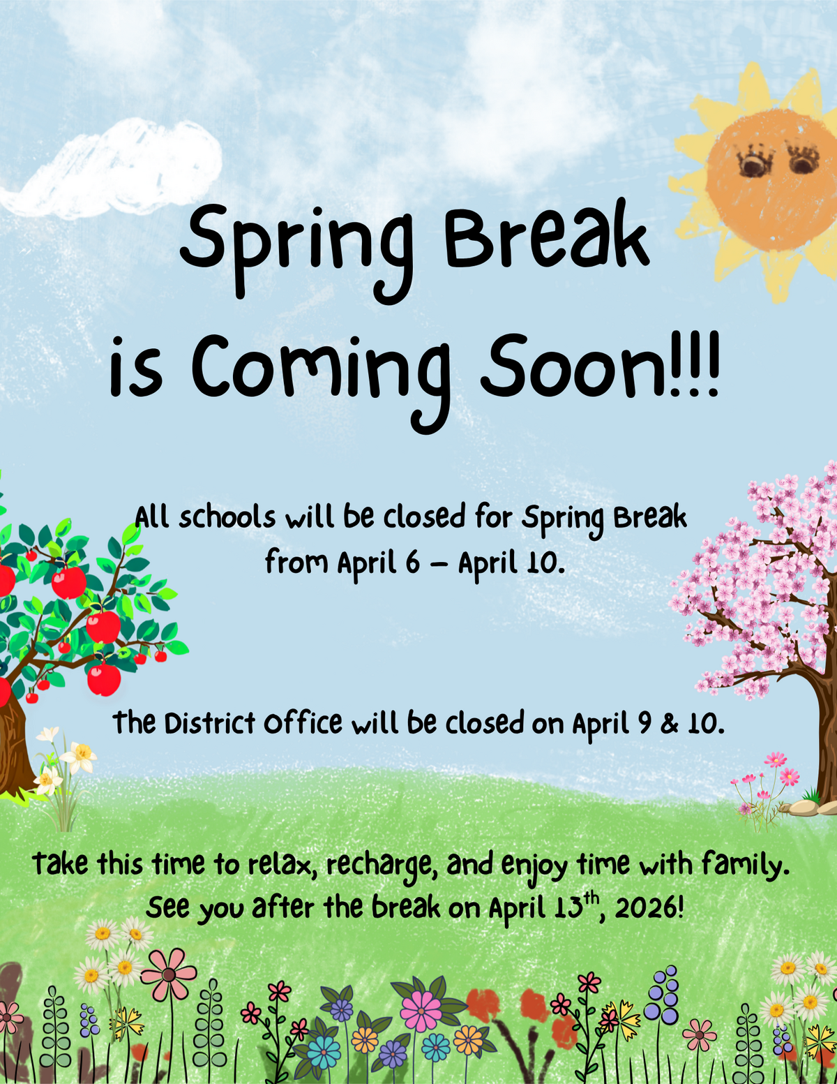 Page: Spring Break is Coming Soon!!! All schools will be closed for Spring Break from April 6 to April 10. The District Office will be closed on April 9 & 10. Take this time to relax, recharge, and enjoy time with family.  See you after the break on April 13th, 2026!