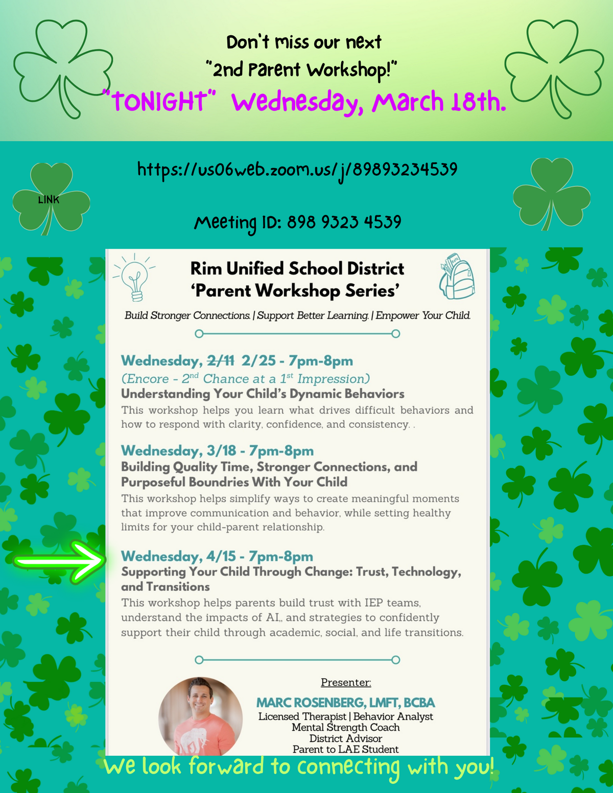 Page:  Special Education “Parent Workshop Series” RIM Unified School District "Parent Workshop Series". Build Stronger Connections/Support Better Learning/Empower Your Child. Wednesday,2/25 from 7 pm to 8 pm. (Encore 2 Chance at 1st Impression). Understanding Your Child's Dynamic Behaviors: This workshop helps you learn what drives difficult behaviors and how to respond with clarity, confidence, and consistency. Wednesday, March 18th, 2026, from 7 pm to 8 pm. Building Quality Time, Stronger Connections, and Purposeful Boundaries With Your Child: This workshop helps simplify ways to create meaningful moments that improve communication and behavior, while setting healthy limits for your child-parent relationship.Wednesday, 4/15,2026, from 7 pm to 8 pm. Supporting Your Child Through Change: Trust, Technology, and Transitions: This workshop helps parents build trust with IEP teams, understand the impacts of AI, and strategies to confidently support their child through academic, social, and life transitions.