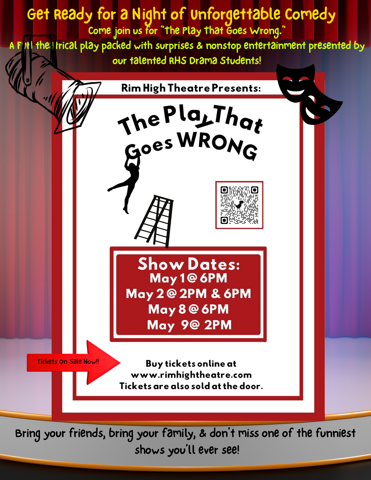 A FUN theatrical play packed with surprises & nonstop entertainment presented by our talented RHS Drama Students! Rim High Presents "The Play That Goes Wrong". Show dates include: May 1 @ 6 pm; May 2 @ 2 pm & 6 pm; May 8 @ 6 pm; May 9 @ 6 pm. Buy tickets online at www.rimhightheatre.com