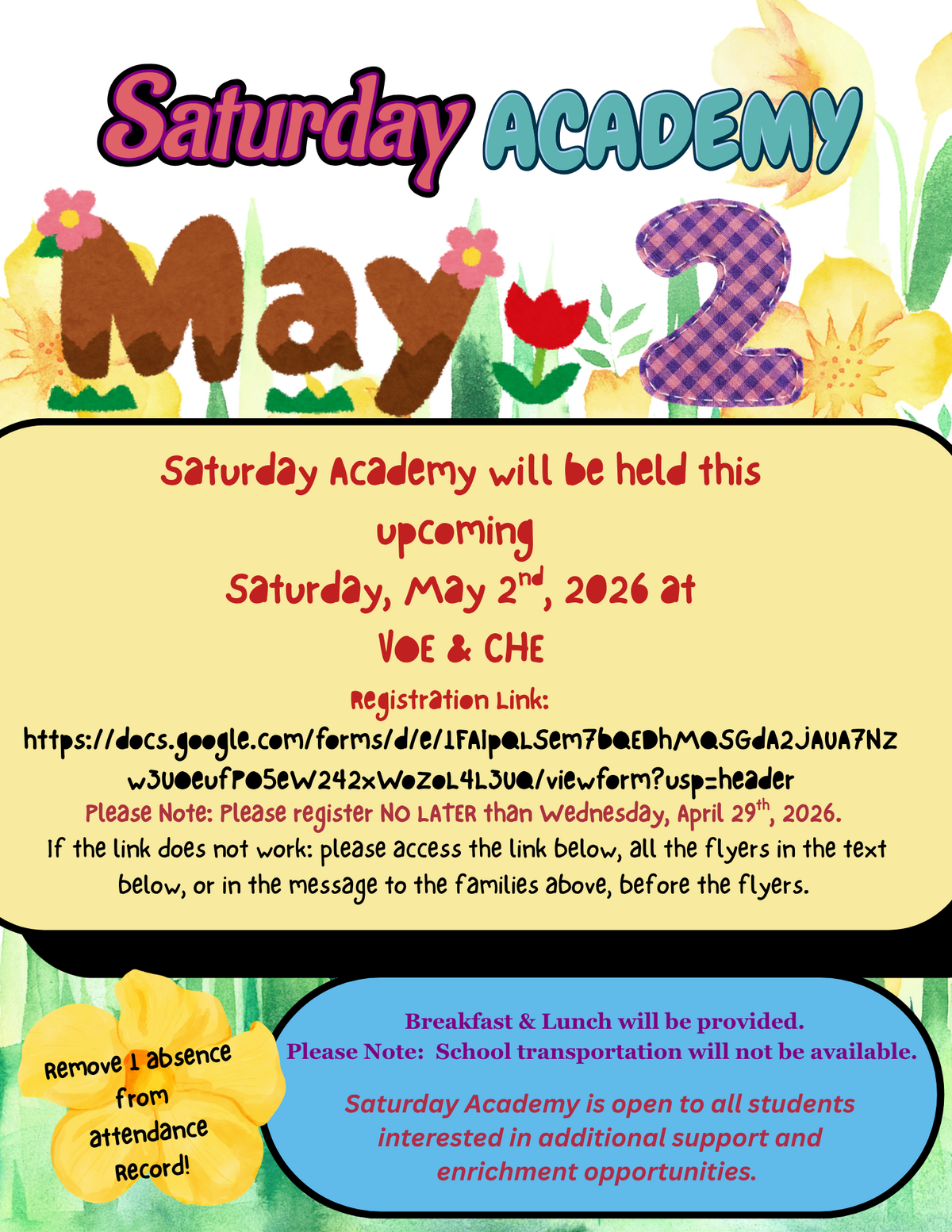 Breakfast & Lunch will be provided. Please note:  School transportation will not be available. Saturday Academy is open to all students interested in additional support and enrichment opportunities. Remove 1 absence from the attendance record!