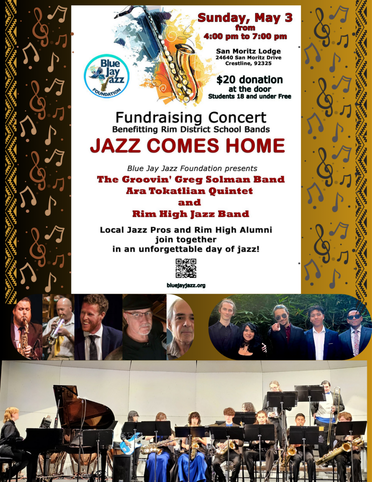Page: Jazz Concert: Sunday, May 3, from 4 pm to 7 pm at San Moritz Lodge located at 24640 San Moritz Drive, Crestline, 92325. Donations are $20 at the door. Students 18 and under are free. Fundraising concert-benefitting the Rim District School bands. "Jazz Comes Home"