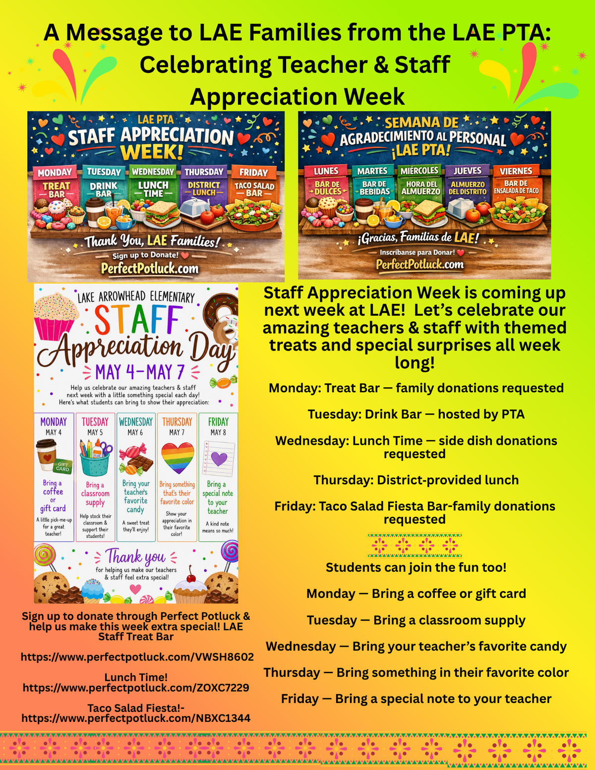 Page: A Message to LAE Families from the LAE PTA: Celebrating Teacher & Staff Appreciation Week. Staff Appreciation Week is coming up next week at LAE!  Let’s celebrate our amazing teachers & staff with themed treats and special surprises all week long!