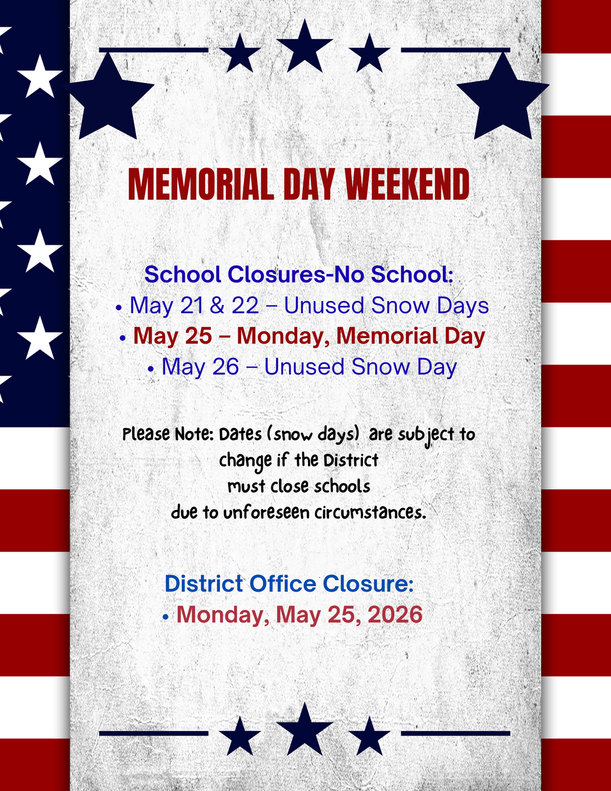 • May 21 & 22 – Unused Snow Days  • May 25 – Monday, Memorial Day  • May 26 – Unused Snow Day. Please Note: Dates (snow days)  are subject to change if the District must close schools due to unforeseen circumstances. District Office Closure: • Monday, May 25, 2026