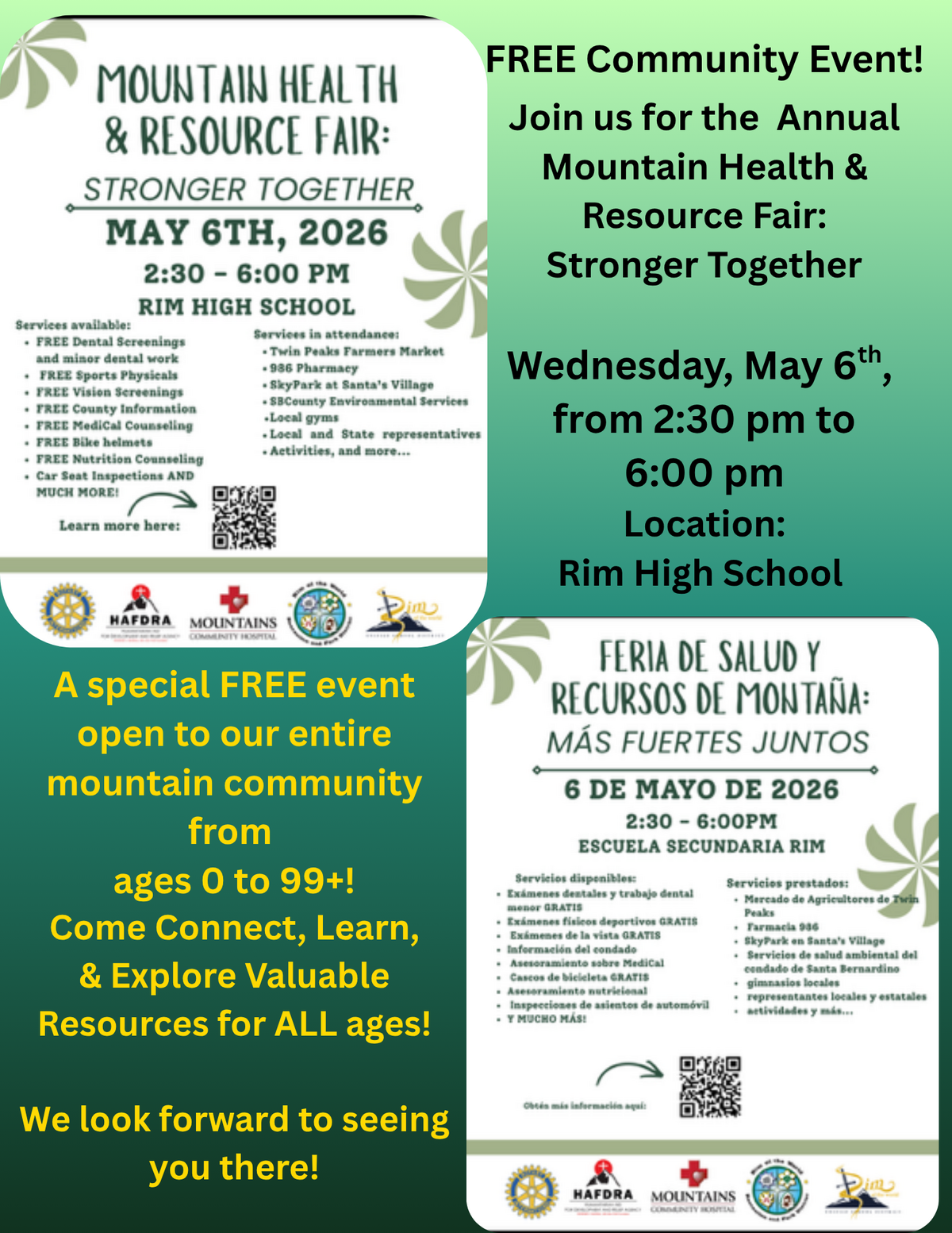 Location: Rim High School. A special FREE event open to our entire mountain community, ages 0 to 99+. Services available: Free dental screenings and minor dental work, free sports physicals, free vision screenings, Free County information, Free MediCal counseling, Free Bike helmets, free nutrition counseling, car seat inspections, and much more.  Services in attendance: Twin Peaks Farmers Market,  986 Pharmacy, Skypark at Santa's Village, SB Environmental Health Services, Local gyms, activities, and more. Mark Your Calendars! Join us for the Annual Mountain Health & Resource Fair: Stronger Together, May 6th, 2026, from 2:30 pm to 6:00 pm, Location: Rim High School. Come Connect, Learn,& Explore Valuable Resources for ALL ages! We look forward to seeing you there!